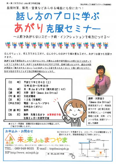 - 【就労】話し方のプロに学ぶ“あがり”克服セミナー(女性求職者限定セミナー)※託児(先着3名)可能