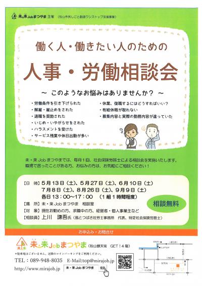 未・来Jobまつやまでは、毎月1回、社労保険労務士による相談会を実施いたします。