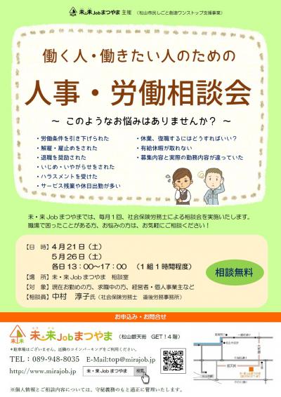 未・来Jobまつやまでは、毎月1回、社労保険労務士による相談会を実施いたします。