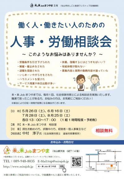 未・来Jobまつやまでは、毎月1回、社労保険労務士による相談会を実施いたします。
