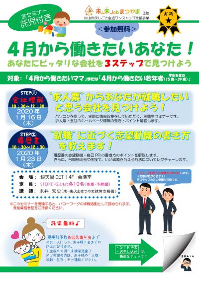 【対 象】 「4月から働きたいママ」または「4月から働きたい若年者(15歳~39歳:学生を含む)」