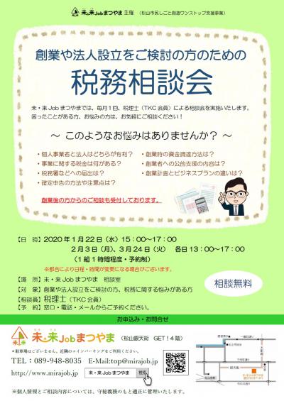 未・来Jobまつやまでは、毎月1回、税理士(TKC会員)による相談会を実施いたします。困ったことがある方、お悩みの方は、お気軽にご相談ください!