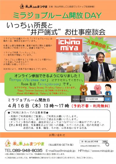 - 【ミラジョブルーム開放DAY】いっちぃ所長と”井戸端式”お仕事座談会