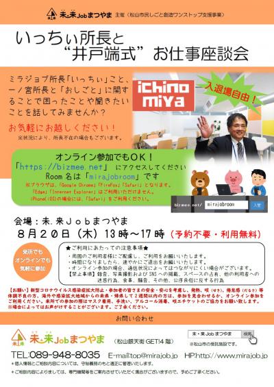 ★ミラジョブ所長「いっちぃ」こと、一ノ宮所長と「おしごと」に関することで困ったことや聞きたいことを話してみませんか?