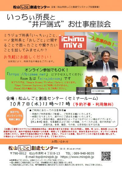 ★ミラジョブ所長「いっちぃ」こと、一ノ宮所長と「おしごと」に関することで困ったことや聞きたいことを話してみませんか?