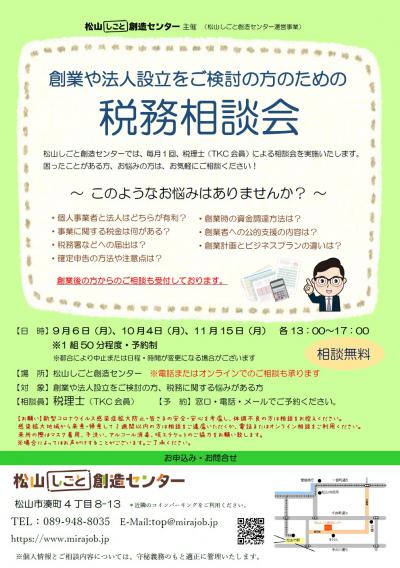 松山しごと創造センターでは、毎月1回、税理士(TKC会員)による相談会を実施いたします。困ったことがある方、お悩みの方は、お気軽にご相談ください!