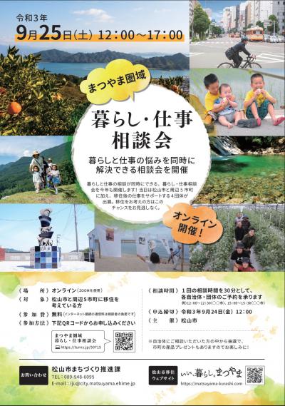 四国最大の都市・愛媛県松山市と周辺5市町に加え、移住後の仕事をサポートする4団体へ、ご自宅にいながら「暮らし」と「仕事」相談ができる、まつやま圏域暮らし・仕事相談会を9月25日(土)に開催します!昨年に引き続き、オンライン(ZOOMを使用)で開催します。